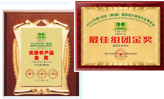 德保縣商務(wù)局榮獲最佳組團(tuán)金獎(jiǎng)、德??h湘里食品有限公司總經(jīng)理胡朝霞、廣西綠鴻養(yǎng)牛有限公司董事長朱慧琳獲得中國現(xiàn)代農(nóng)業(yè)領(lǐng)軍人物獎(jiǎng)、廣西綠鴻養(yǎng)牛有限公司、“牛王道”牌牛肉獲得2022年中國·深圳(第8屆)國際現(xiàn)代綠色農(nóng)業(yè)博覽會(huì)優(yōu)質(zhì)農(nóng)產(chǎn)品金獎(jiǎng)。